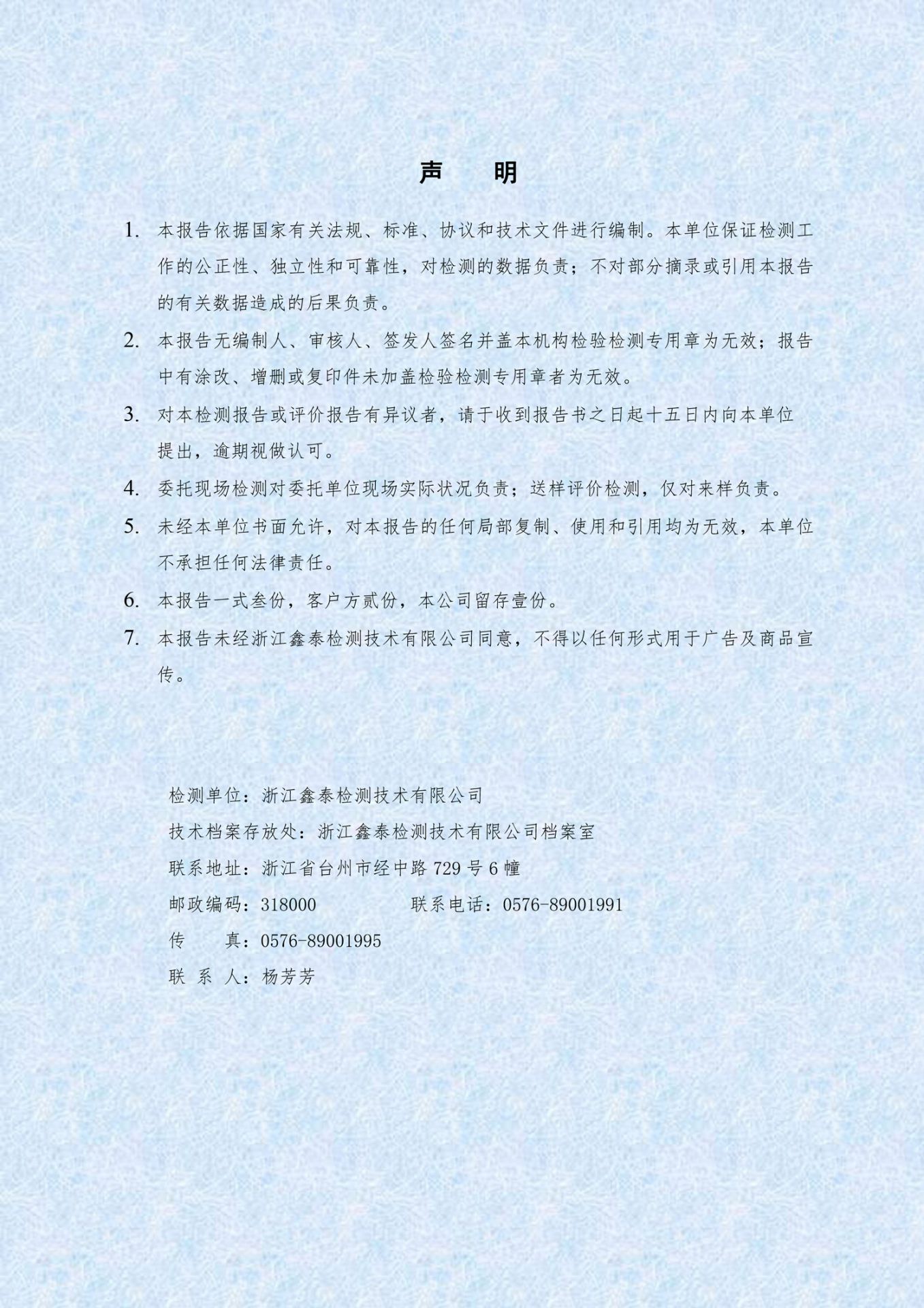 【概要描述】本报告依据国家有关法规、标准、协议和技术文件进行编制。本单位保证检测工作的公正性、独立性和可靠性,对检测的数据负责;不对部分摘录或引用本报告的有关数据造成的后果负责。